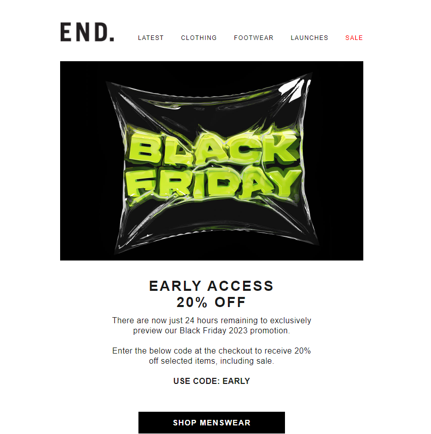 END. ()에서 2023년 블랙 프라이데이 프로모션인 Early Access가 시작됐습니다! 단 하루, 선별된 아이템들을 20% 할인된 가격에 만나보세요. 프로모션 코드 'EARLY' 사용하고, 이 특별한 기회를 놓치지 마세요.